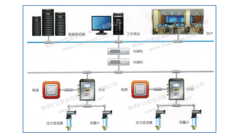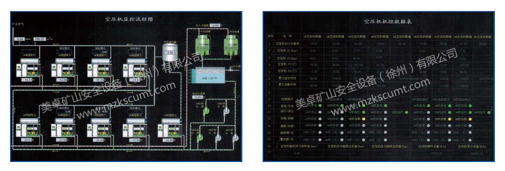 ●显示功能:在地面集控室由工控机显示各压风管路压力、各供水管路流量。设有各设备的故障信号显示,并伴有报警。